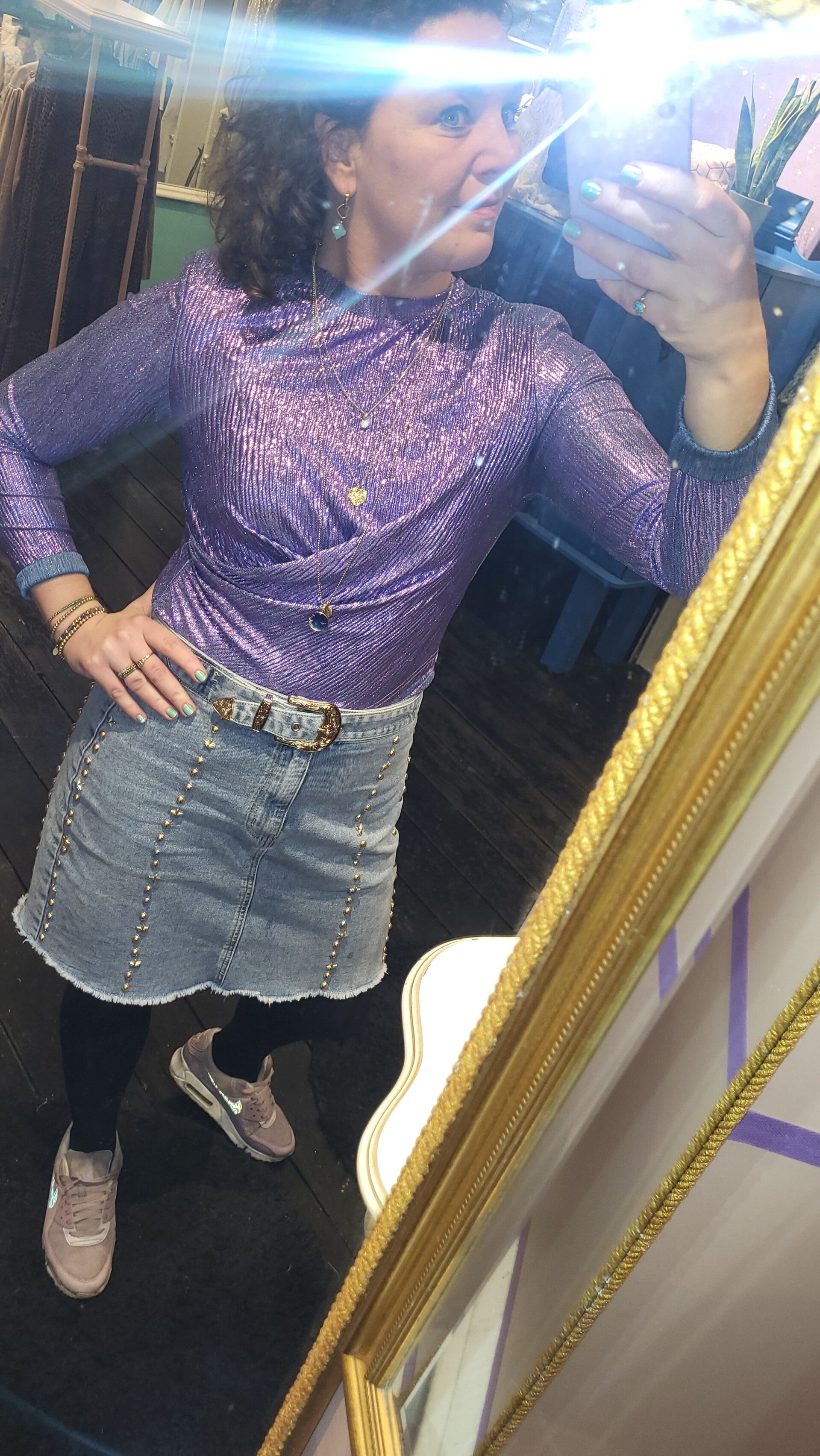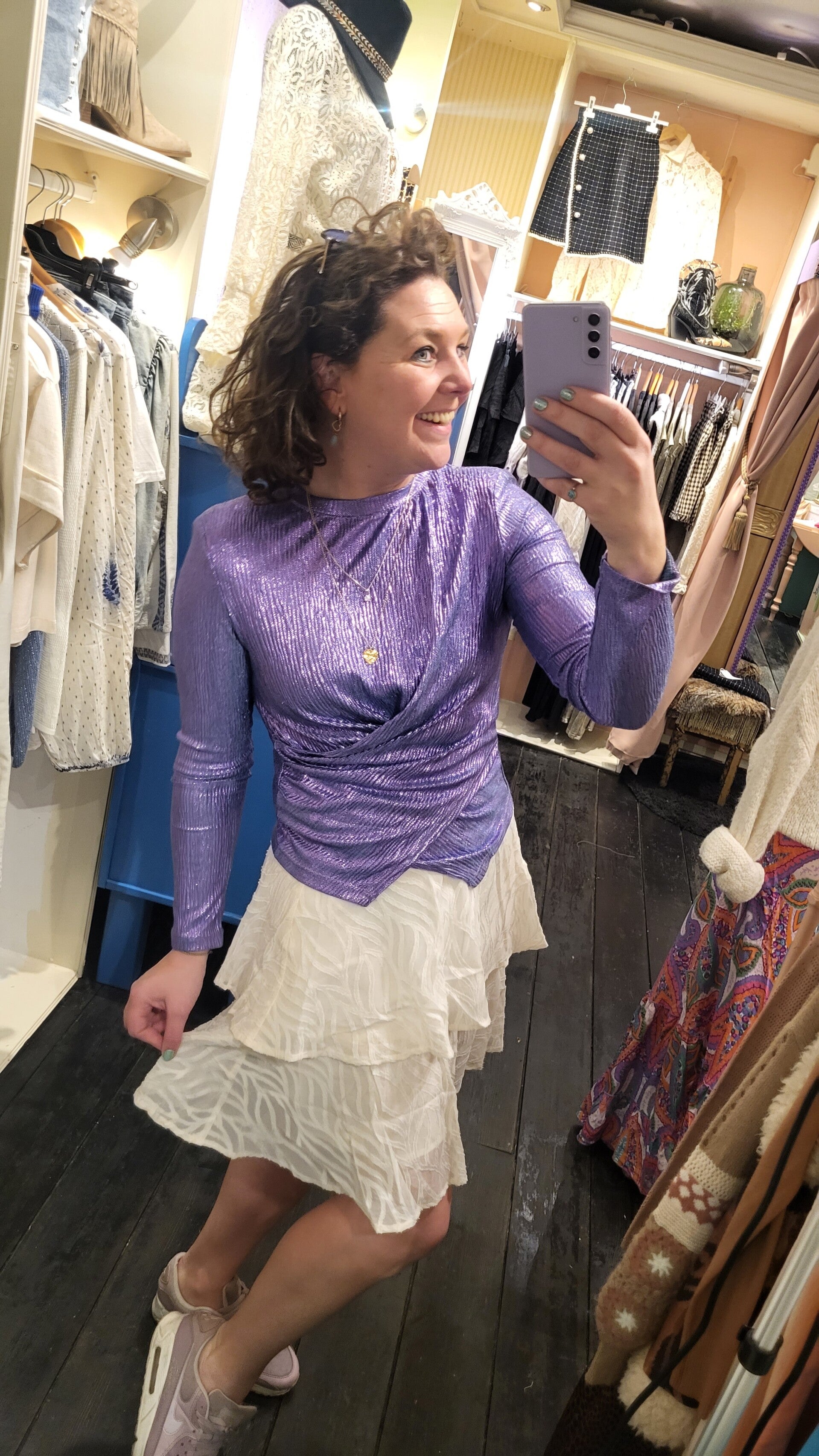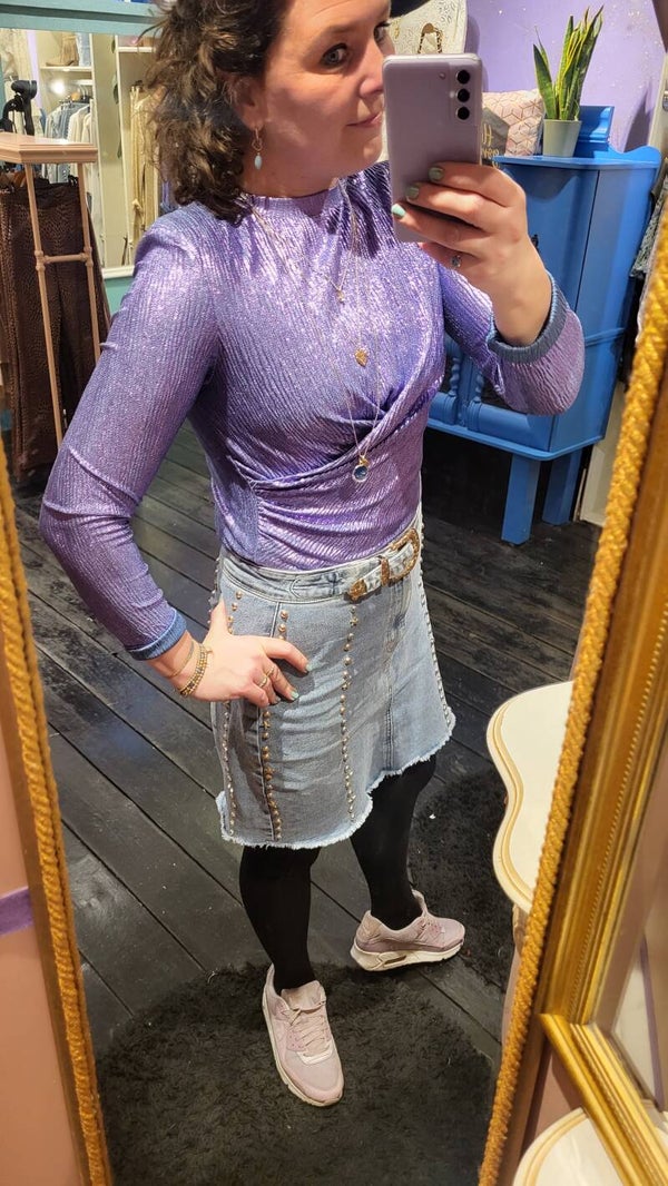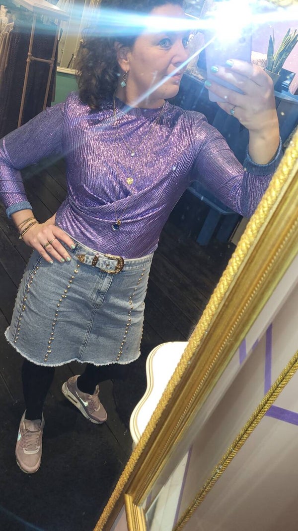 Met mooie draai twist en leuk detail als je het mouwtje omslaat komt er een mooie blauwe kleur tevoorschijn.