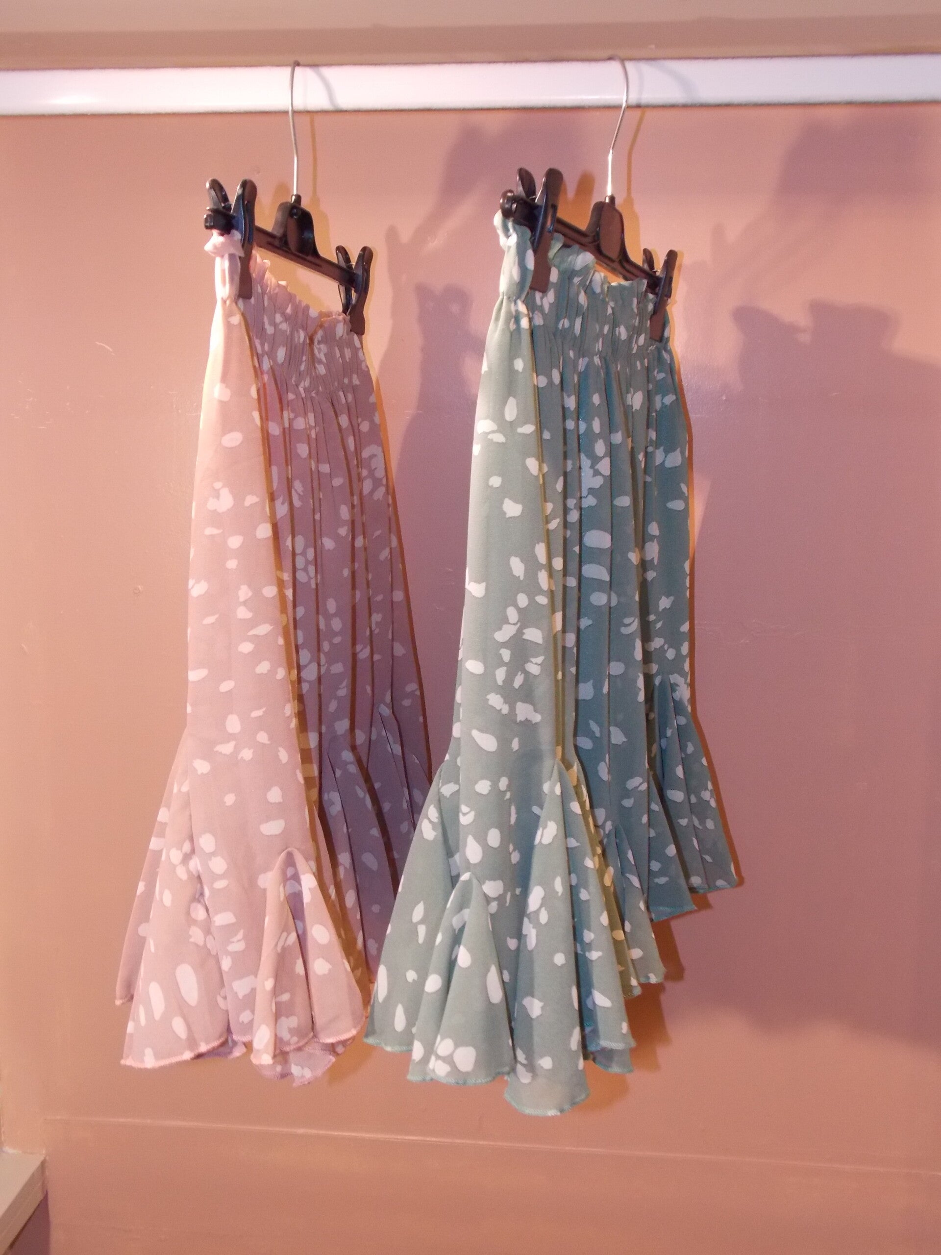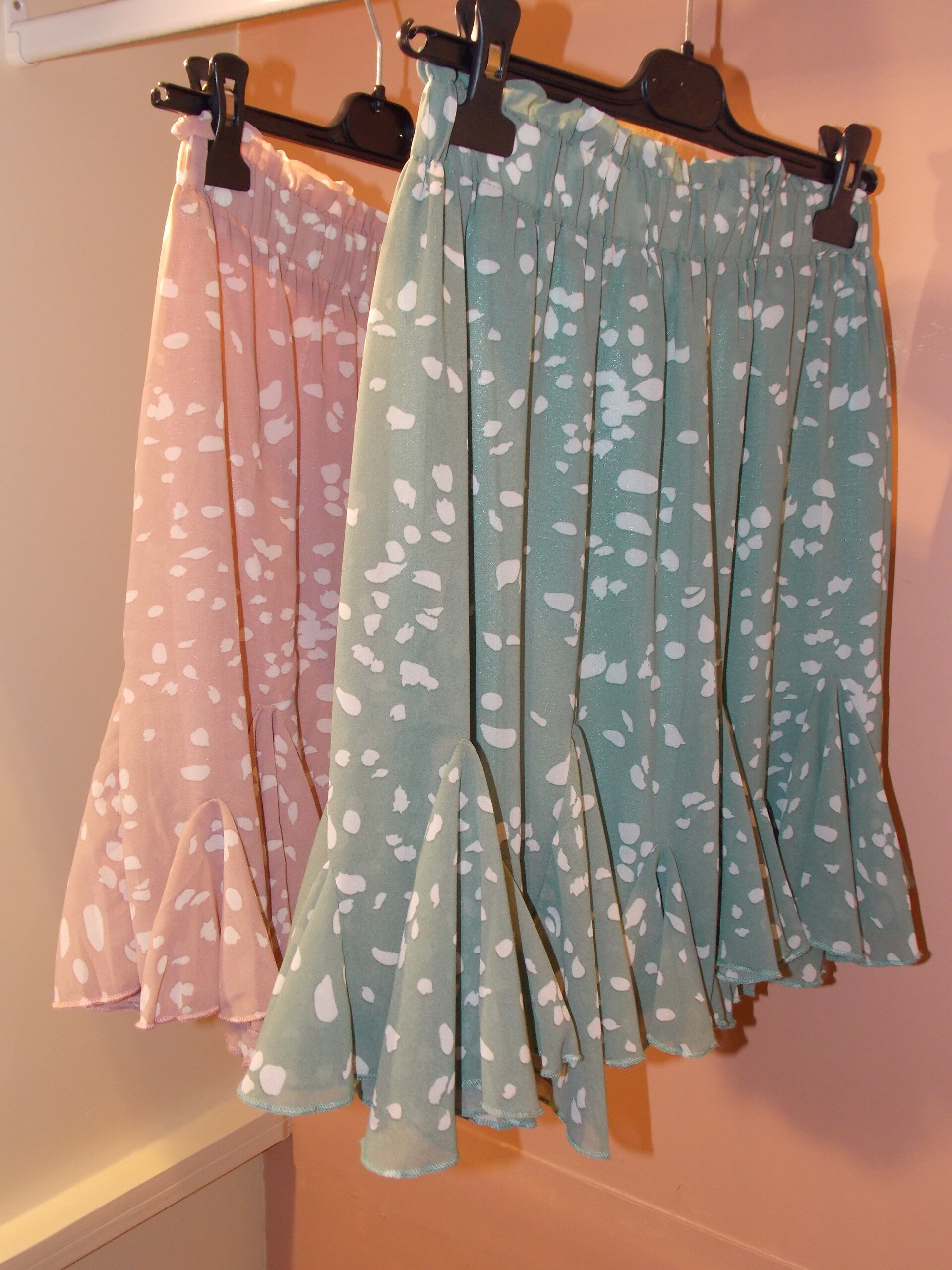Rokjes hebben een elastische band in de taille en een mooie klokkend model. Met stippen printje.